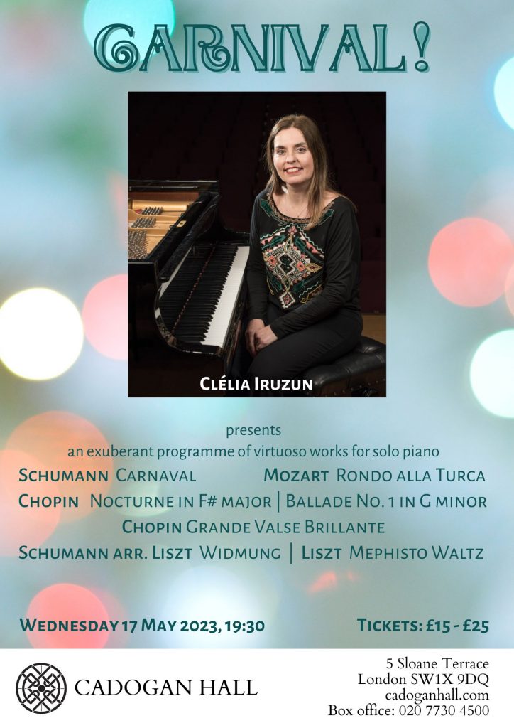 Recital no Cadogan Hall no dia 17 de maio às 19:30 Mozart Piano Sonata No. 11 in A major, K.331 Schumann Carnaval Chopin Grande valse brillante in E flat major, Op. 18 Chopin Nocturne…