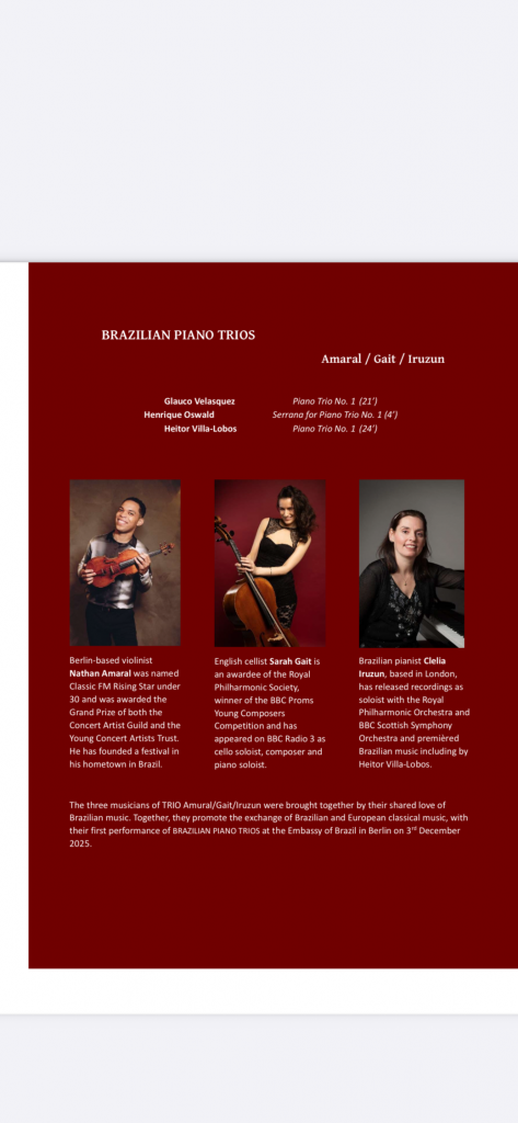 Concerto no dia 3 de Dezembro na Embaixada do Brasil em Berlim Trios Brasileiros com Nathan Amaral, violino, e Sarah Gait, violoncelo Glauco Velasquez- Trio No.1 Henrique Oswald- Serrana Villa-Lobos- Trio No.1